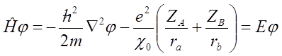 gdzie ZA i ZB są ładunkami jąder, które można zastąpić efektywnymi ładunkami co w pewnym stopniu pozwala na uwzględnienie oddziaływania pomiędzy elektronami. Jeżeli elektron przebywa w pobliżu jądra atomu A to wpływ na energię układu ma ta część hamiltonianu, która opisuje elektron w polu atomu A. To prowadzi do stwierdzenia, że w pobliżu atomu A orbital cząsteczkowy ma charakter zbliżony do orbitalu atomowego. Analogiczna sytuacja ma miejsce gdy elektron znajduje się w pobliżu atomu B cząsteczki. Ponieważ orbital cząsteczkowy ma charakter orbitali atomów A i B to możemy zapisać orbital cząsteczkowy jako sumę orbitali atomowych: