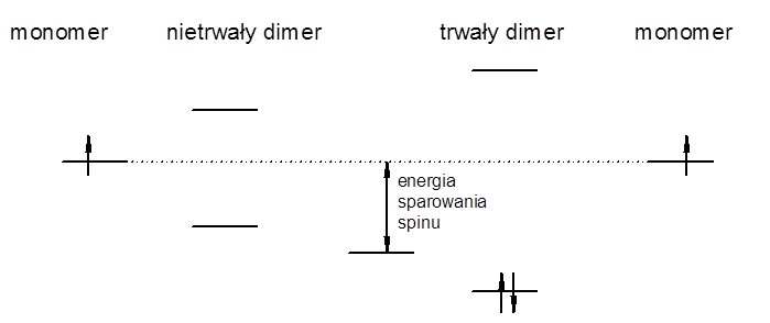 Można powyższe uogólnienia zastosować do wyjaśnienia kwestii stosunkowo rzadkiego występowania układów rodnikowych, czyli cząsteczek paramagnetycznych. Cząsteczki takie posiadają na powłoce walencyjnej niesparowane elektrony, które są słabo związane z atomem. Dimeryzację dwóch rodników można schematycznie przedstawić następująco:
