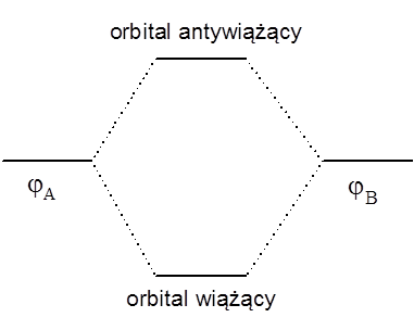 a orbitale cząsteczkowe mają postać φ+ = N+(φA + φB) i φ– = N–(φA – φB). Jeden z orbitali cząsteczkowych leży na skali energii poniżej pierwotnego poziomy a drugi powyżej. Orbital o mniejszej wartości energii nazywamy wiążącym, a wyżej energetyczny antywiążącym. Obrazowo można to przedstawić następująco: