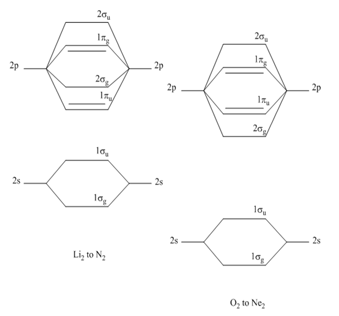 W przypadku pierwiastków lżejszych, do azotu, orbitale cząsteczkowe 1πu są niżej energetyczne niż 2σg, dla tlenu i fluoru konfiguracja tych orbitali ulega odwróceniu. Symbole "g" oraz "u" wynikają z symetrii orbitali cząsteczkowych, a ich wyjaśnienie znajduje się w części dotyczącej symetrii.
