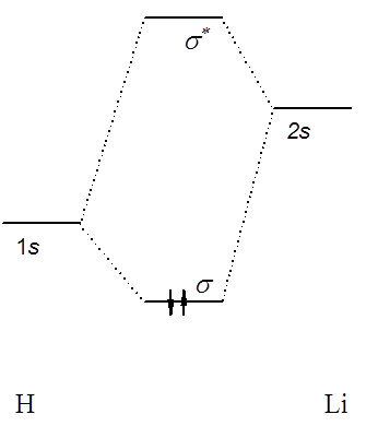 Weźmy pod uwagę cząsteczkę LiH, w której nie występuje symetria płaszczyzna symetrii pomiędzy jądrami. Orbitalami walencyjnymi atomów w tej cząsteczce są orbital 1s H i 2s litu zawierające każdy po jednym elektronie. Obydwa orbitale mają symetrię typu σ i mogą tworzyć dwa orbitale cząsteczkowe. Ponieważ mamy dwa elektrony, więc zapełniony będzie orbital wiążący i cząsteczka będzie trwała. Diagram poziomów orbitalnych można przedstawić następująco: