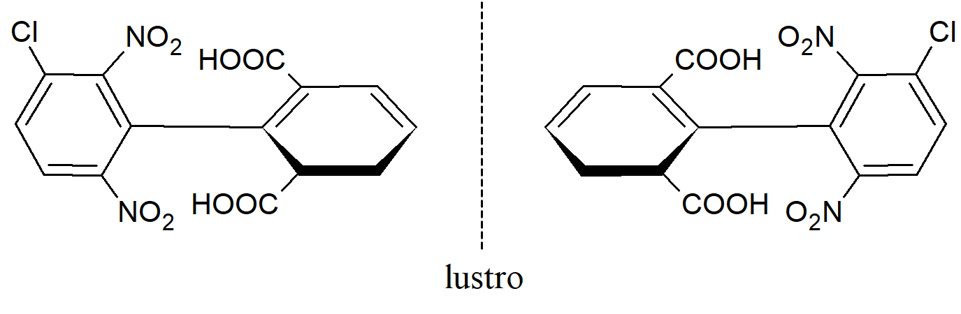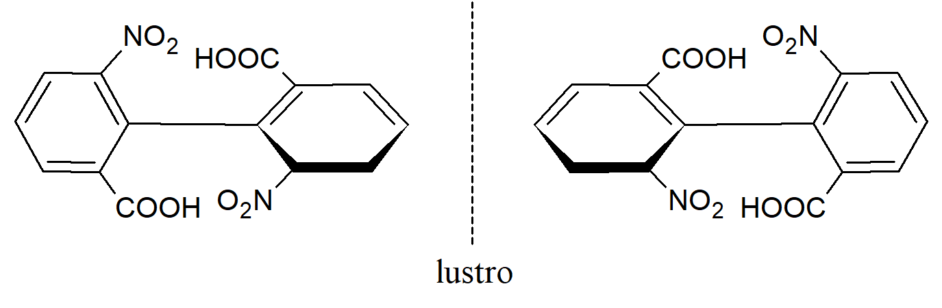 Związki w których występuje blokada rotacji wokół wiązania. Niektóre związki, które nie zawierają asymetrycznych atomów, są jednak chiralne, ponieważ zawierają strukturę, którą składającą się z dwóch prostopadłych płaszczyzn, z których żadna nie może być nałożona na drugą w wyniku działania płaszczyzny symetrii. Bifenyle zawierające cztery duże grupy w pozycjach orto nie mogą swobodnie obracać się wokół centralnego wiązania ze względu na zawadę przestrzenną. Przykładowo bariera rotacji dla 2-karboksy-2’-metoksy-6-nitrobifenylu wynosi ΔG =21,8 kcal·mol-1. Niektóre związki, które nie zawierają asymetrycznych atomów, są jednak chiralne, ponieważ zawierają strukturę, którą składającą się z dwóch prostopadłych płaszczyzn, z których żadna nie może być nałożona na drugą w wyniku działania płaszczyzny symetrii. Bifenyle zawierające cztery duże grupy w pozycjach orto nie mogą swobodnie obracać się wokół centralnego wiązania ze względu na zawadę przestrzenną. Przykładowo bariera rotacji dla 2-karboksy-2’-metoksy-6-nitrobifenylu wynosi ΔG =21,8 kcal·mol-1.
