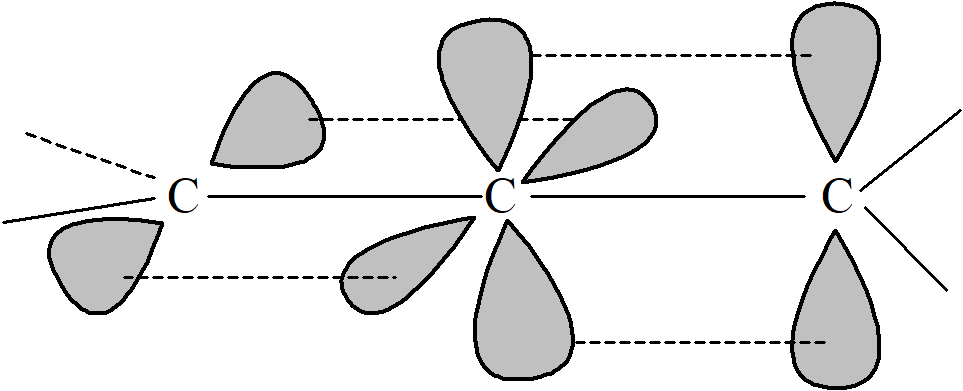 W allenach centralny atom węgla jest w stanie hybrydyzacji sp. Pozostałe dwa orbitale p są wzajemnie prostopadłe i każdy z nich oddziałuje z orbitalem p sąsiedniego atomu węgla, wymuszając tym samym położenie dwóch pozostałych wiązań węgla do zawierania się w prostopadłych płaszczyznach.