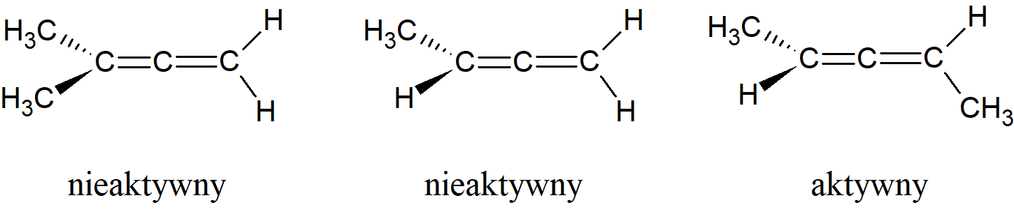 Związki ze stereogenicznym atomem węgla. Jeśli jest tylko jeden taki atom, cząsteczka musi być optycznie aktywna. Dzieje się tak bez względu na to, jak niewielkie są różnice między czterema grupami. Aktywność optyczna została wykryta nawet w przypadkach, takich jak 1-butanol-1-D, gdzie jedna grupa to wodór, a druga deuter: