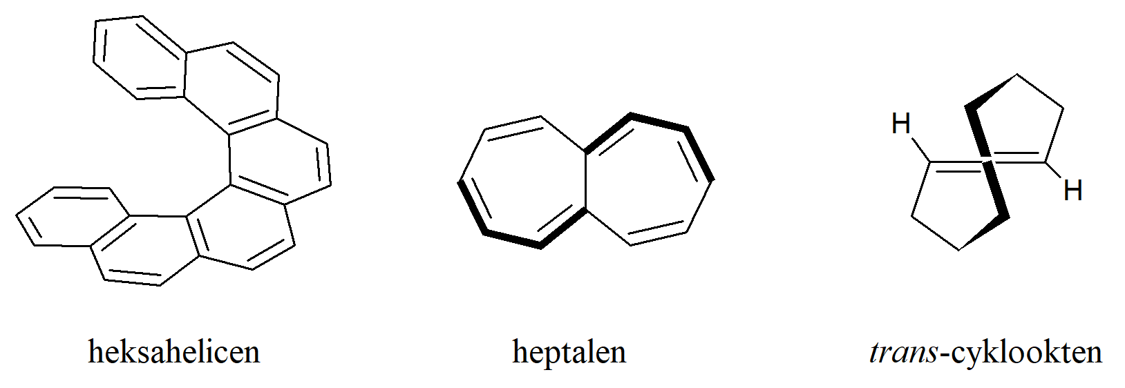 Chiralność wynikająca ze spiralnego kształtu cząsteczki. Otrzymano związki, które są chiralne, ponieważ mają kształt helikalny i dlatego mogą być orientowane w lewo lub w prawo. Cała cząsteczka jest zwykle krótsza niż jeden pełny obrót helisy, ale nie zmienia to możliwości wystąpienia lewo– i prawoskrętności. Przykładem jest heksahelicen. Bariera rotacyjna dla helicenu wynosi 22,9 kcal·mol–1 i jest znacznie wyższa, gdy zostanie podstawniona. Wykazano, że dianion helicenu zachowuje swoją chiralność. Heptalen to kolejny związek, który nie jest płaski. Jego skręcona struktura sprawia, że jest chiralny, ale enancjomery szybko ulegają konwersji.