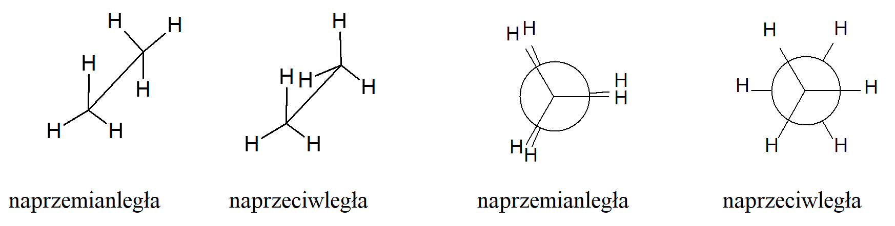 Dla każdego wiązania pojedynczego o otwartym łańcuchu, które łączy dwa atomy węgla o hybrydyzacji sp3, możliwa jest nieskończona liczba konformacji, z których każda ma związaną z nią określoną energię. W praktyce liczba konformacji jest znacznie mniejsza. Jeśli zignoruje się powtórzenia wynikające z symetrii, liczbę konformacji można oszacować jako większą niż 3n, gdzie n jest liczbą wewnętrznych wiązań C–C. Na przykład n-pentan ma 11 konformerów, n-heksan 35, n-heptan 109, n-oktan 347, n-nonan 1101 i n-dekan 3263. Dla etanu istnieją dwie skrajne konformacje, konformacja o najwyższej i o najniższej energii potencjalnej, które można przedstawić na dwa sposoby: