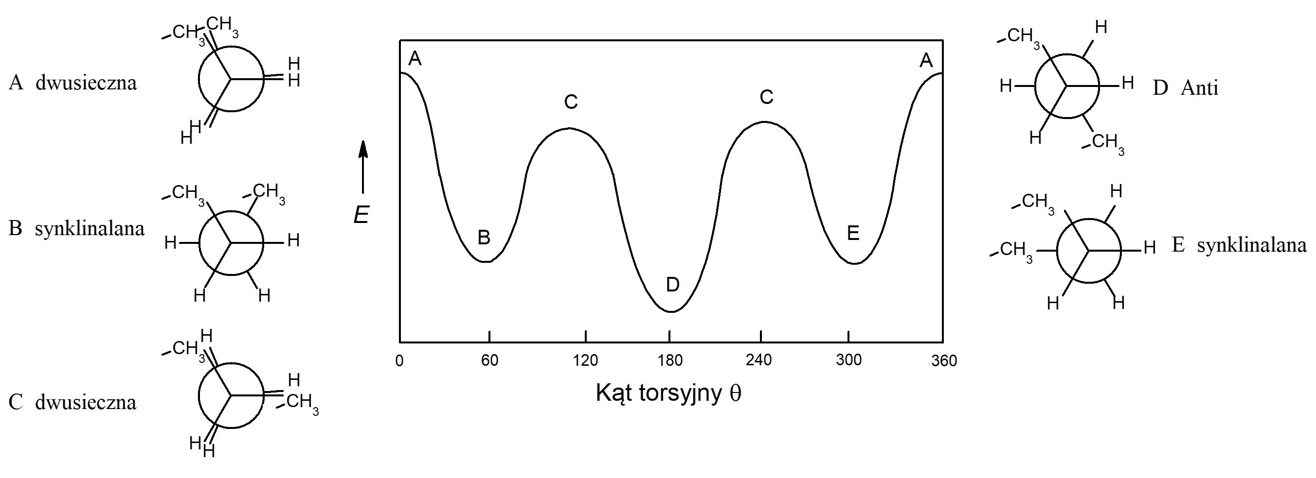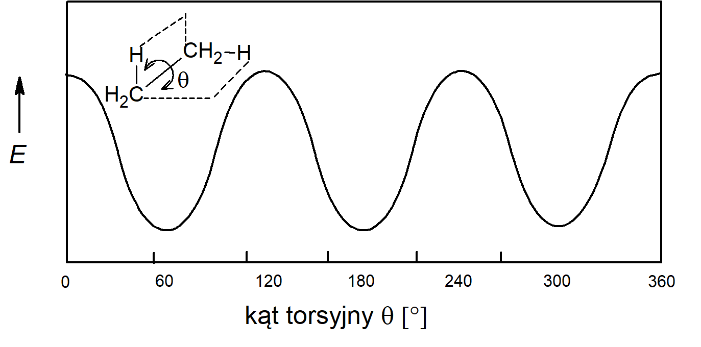 Projekcja Newmana (wzór rzutowy), pokazana na dwóch schematach po prawej stronie, jest przedstawieniem przestrzennym rozmieszczenia wiązań dwóch sąsiadujących ze sobą atomów w indywiduum molekularnym. Strukturę przedstawia się jako widzianą wzdłuż wiązania łączącego te dwa atomy, a wiązania biegnące od nich do pozostałych podstawników są rysowane jako rzuty na płaszczyźnie papieru. Wiązania atomu bliższego do patrzącego są rysowane tak, że spotykają się w środku okręgu przedstawiającego ten atom. Wiązania atomu bardziej oddalonego rysuje się jako wystające spoza okręgu. Zmiany energii cząsteczki w funkcji zmian kąta torsyjnego przedstawia schemat: