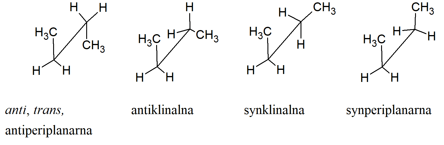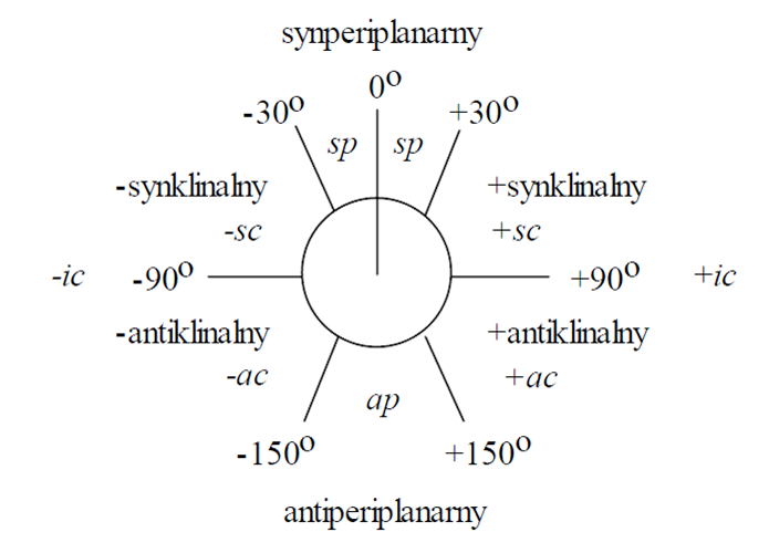 Generalnie, sterochemiczne ułożenie odpowiadające kątom torsyjnym pomiędzy 0o i ±90o nazywa się syn (s), kątom torsyjnym pomiędzy ±900 i 180o anti (a). Podobnie, ułożenie podstawników odpowiadające kątowi torsyjnemu pomiędzy –30o i –1500 albo pomiędzy 30o i 1500 nazywane jest klinalnym (c), a pomiędzy 0o i ±30o albo ±150o i 180o nazywane jest periplanarnym (p). Te dwa rodzaje terminów można połączyć tak, aby definiowały cztery zakresy katów torsyjnych: 0o do ±30o synperiplanarny (sp), 30o do 90o i –30o do –90o synklinalny (sc), 90o do 150o i –90o do –150o antiklinalny (ac), ±150o do 180o antiperiplanarny (ap). Ułożenie podstawników odpowiadające kątowi torsyjnemu 90o nazywa się izoklinalnym (+ic, -ic).