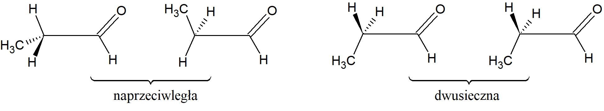 Wszystkie omówione konformacje obejmowały rotację wokół wiązań sp3–sp3. Przeprowadzono również badania nad związkami, w których mamy do czynienia z wiązaniami sp3–sp2. Na przykład propanal (lub inna podobna cząsteczka) ma cztery skrajne konformacje, z których dwie nazywane są naprzeciwległymi, a dwie dwusiecznymi. W przypadku propanalu konformacje naprzeciwległe mają mniejszą energię niż pozostałe dwie, przy czym różnica energetyczna pomiędzy tymi konfiguracjami wynosi 1 kcal·mol–1 (4 kJ·mol–1).