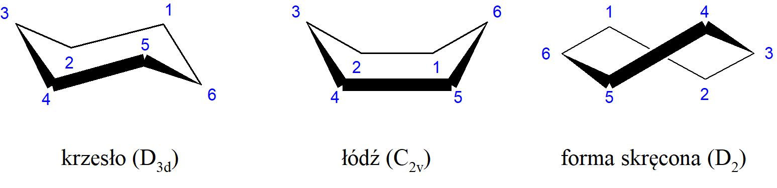 Konformacje te można opisać następująco: Jeżeli atomy węgla 1, 2, 4 i 5 cykloheksanu leżą w jednej płaszczyźnie, a atomy 3 i 6 znajdują się po przeciwnych stronach tej płaszczyzny to konformacja pierścienia (o symetrii D3d) nazywana jest formą krzesłową. Tym samym terminem określa się podobne konformacje nasyconych pierścieni sześcioczłonowych zawierających heteroatom i/lub mających podstawniki, ale te konformacje mogą być odkształcone od symetrii ściśle D3d. Dla cykloheksanu i większości jego analogów forma krzesłowa jest najstabilniejszą konformacją. Jeżeli konformacja cykloheksanu nie ma środka symetrii, natomiast ma dwie płaszczyzny symetrii - jedną, przecinającą wiązania pomiędzy atomami 1 i 2 oraz pomiędzy atomami 4 i 5 i drugą, przechodzącą przez atomy 3 i 6 (leżące poza, ale po jednej stronie płaszczyzny wyznaczonej przez atomy 1, 2, 4, i 5) to ta konformacja (należąca do grupy symetrii C2v) jest nazywana formą łodziową i na ogół jest formą niestabilną. I w tym przypadku termin łódź używany jest w odniesieniu do strukturalnych analogów. Konformacja o symetrii D2 pojawiająca się w trakcie interkonwersji dwóch form łodziowych cykloheksanu jest nazywana formą skręconą (czasami także skośną łodzią, formą skośną lub formą rozciągniętą). W pierścieniu pięcioczłonowym konformacja, w której dwa sąsiadujące atomy są maksymalnie odsunięte w przeciwnych kierunkach od płaszczyzny wyznaczonej przez trzy pozostałe atomy węgla, była nazywana półkrzesłem. Lepiej nazywać ją konformacją skręconą (patrz także konformacja kopertowa). W chemii węglowodanów termin konformacja skręcona odnosi się do pierścienia pięcioczłonowego, a konformację pierścienia sześcioczłonowego o symetrii D2 określa się jako skośną.
