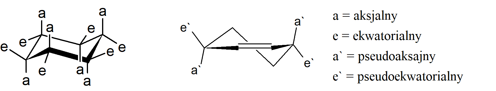 W formie krzesłowej cykloheksanu wiązania z atomami pierścienia (i indywidua molekularne przyłączone tymi wiązaniami) są nazywane aksjalnymi lub ekwatorialnymi w zależności od tego, czy tworzą względnie duży czy mały kąt z płaszczyzną zawierającą lub przechodzącą najbliżej większości atomów pierścienia. Tak więc wiązania aksjalne są w przybliżeniu równoległe do osi C3, a wiązania ekwatorialne są w przybliżeniu równoległe do dwóch wiązań pierścienia. Takie nazwy są również stosowane dla krzesłowych form innych nasyconych pierścieni sześcioczłonowych. Analogiczne wiązania występujące w pozycjach allilowych mono-nienasyconych pierścieni sześcioczłonowych nazywane są pseudoaksjalnymi (lub quasi-aksjalnymi) i pseudoekwatorialnymi (lub quasi-ekwatorialnymi).