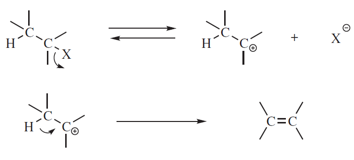 Jednocząsteczkowy mechanizm E1 przebiega w dwóch etapach, z których determinującym szybkość reakcji jest proces jonizacji substratu z utworzeniem karbokationu, który szybko traci proton przyłączany przez zasadę, najczęściej rozpuszczalnik.