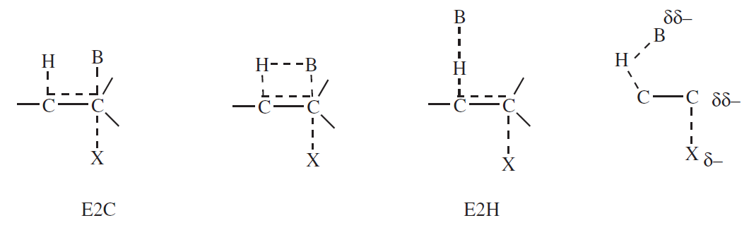 Na jednym końcu znajduje się mechanizm (E2C), w którym w stanie przejściowym zasada oddziałuje głównie z węglem. Mechanizm E2C obejmuje reakcje z silnymi nukleofilami, które są słabymi zasadami. Na drugim biegunie znajduje się mechanizm E2, określony jako E2H, zachodzący w obecności silnych zasad.