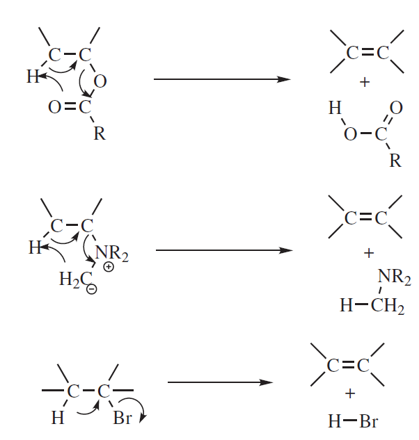 Bez względu na mechanizm, jeśli w cząsteczce istnieje wiązanie podwójne (C=C lub C=O) lub pierścień aromatyczny, który może być sprzężony z nowym, powstającym wiązaniem podwójnym, produkt reakcji o wiązaniach skoniugowanych zwykle przeważa, nawet gdy stereochemia reakcji jest niekorzystna.