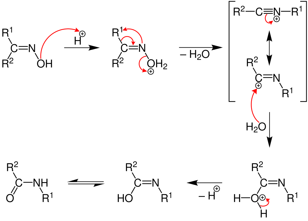 Przegrupowanie Beckmana – przegrupowanie oksymów do amidów katalizowane przez kwasy. Cykliczne oksymy przegrupowują do laktamów. W wyniku działania protonu H+ na cząsteczkę oksymu, powstaje jon oksoniowy, a grupa R' znajdująca się w położeniu trans (anti) wobec grupy hydroksylowej -OH migruje do atomu azotu tworząc związek przejściowy, który poprzez odłączenie i ponowne przyłączenie cząsteczki wody przechodzi w formę enolową amidu. Katalizatory tej reakcji poprzez przyłączenie się do grupy -OH przekształcają ją w grupę odchodzącą. Migracji do azotu ulega zawsze grupa znajdująca się w położeniu trans względem grupy –OH.