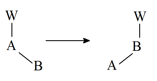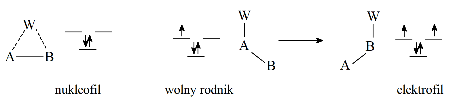 Na schemacie przedstawiono stan przejściowy dla wszystkich trzech przypadków jako pierwszy układ po lewej stronie, w którym dwuelektronowe wiązanie A–W obejmuje orbital na atomie B, który zawiera zero, jeden i dwa elektrony, odpowiednio w przypadku nukleofilowej, rodnikowej i elektrofilowej migracji. Nakładanie się tych orbitali skutkuje powstaniem trzech nowych orbitali, jednego wiążącego i dwóch, zdegenrowany orbitali antywiążących. W przypadku przegrupowania nukleofilowego, które angażuje tylko dwa elektrony, mogą one znaleźć się na orbitalu wiążącym, i stan przejściowy ma niską energię. Natomiast przy migracji wolnorodnikowej lub elektrofilowej zaangażowane są odpowiednio trzy lub cztery elektrony, które muszą znaleźć się na orbitalach antywiążących. Zatem w procesach przegrupowania 1,2 elektrofilowego lub wolnorodnikowego migrującą grupą W jest zwykle aryl lub inna grupa, która może przyjąć dodatkowy jeden lub dwa elektrony, a tym samym skutecznie usunąć je z trójczłonowego stanu przejściowego.