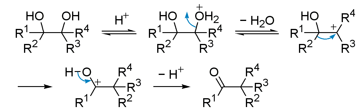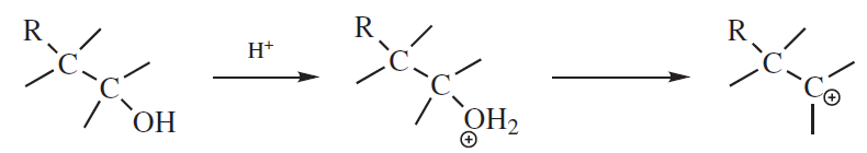 – Tworzenie karbokationu – można je otrzymywać na wiele sposobów, ale jedną z najczęstszych metod, gdy oczekiwane jest przegrupowanie, jest traktowanie alkoholu kwasem w celu uzyskania karbokationu z pośredniego jonu oksoniowego. Te dwa etapy są takie same, jak pierwsze dwa etapy reakcji SN1cA lub E1 w przypadku alkoholi.