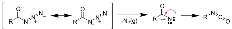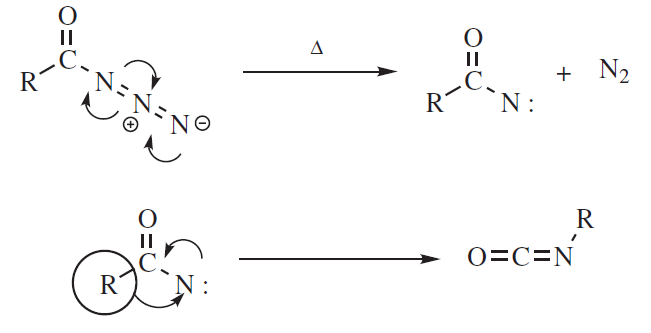 – Tworzenie nitrenów – rozkład azydków acylowych jest jednym ze sposobów tworzenia acylonitrenów. Po migracji atom od którego został przemieszczony podstawnik ma sekstet elektronowy. W kolejnym kroku atom ten uzyskuje oktet elektronowy. W przypadku karbokationów najczęściej występującymi etapami kończącymi są reakcja z nukleofilem (przegrupowanie z podstawieniem) i utratą H+ (przegrupowanie z eliminacją).