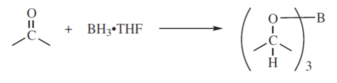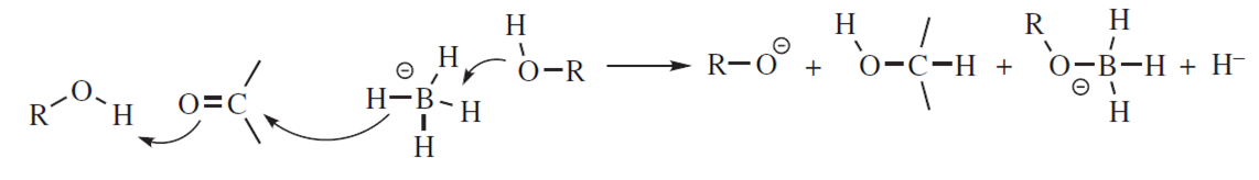 – borany jako środki redukujące: boran (BH3) i podstawione borany redukują aldehydy i ketony przez addycję, w której bor przyłącza się do tlenu, a wodór do węgla: