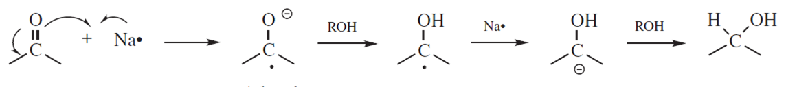 – sód w etanolu: proces nosi nazwę procedury Bouveault-Blanca i była stosowana raczej przy redukcji estrów karboksylowych niż aldehydów lub ketonów przed odkryciem LiAlH4. W przypadku reakcji z sodem w etanolu zasugerowano następujący mechanizm: