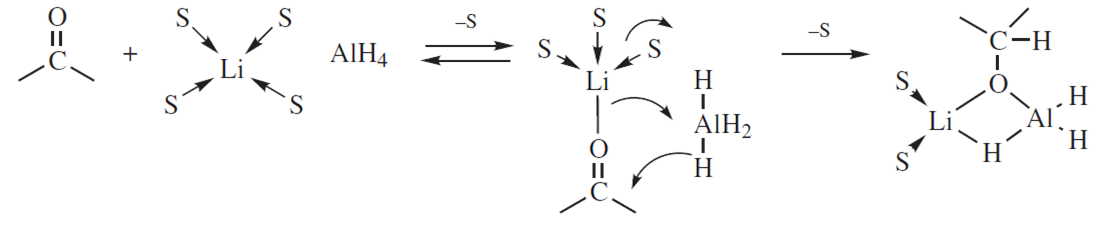 W przypadku redukcji związków karbonylowych przy zastosowaniu LiAlH4 lub NaBH4 aktywnymi związkami są odpowiednio AlH4– i BH4–, które przenoszą jon H– do atomu węgla. Dla LiAlH4 zaproponowano taki mechanizm procesu: