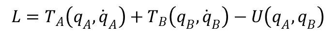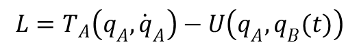 gdzie pierwsze dwa wyrazy są energiami kinetycznymi układów A i B, a trzeci określa wspólną energię potencjalną. Teraz zamiast współrzędnych uogólnionych qB wstawimy dane funkcje czasu i pominiemy wyraz dotyczący znanej energii kinetycznej układu B otrzymujemy: