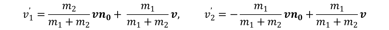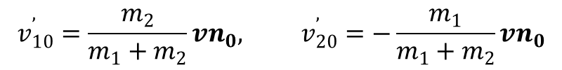 Z zasady zachowania pędu wynika, że pędy cząstek po zderzeniu są równe i przeciwnie skierowane, a z zasady zachowania energii wynika. że nie zmieniają one swoich bezwzględnych wartości. Tak więc wskutek zderzenia cząstki zmieniają w układzie środka masy zwroty swoich prędkości, a nie zmieniają wartości bezwzględnej prędkości. Oznaczając przez n0 jednostkowy wektor w kierunku prędkości możemy prędkości cząstek po zderzenie zapisać w postaci (prim oznacza prędkość po zderzeniu):