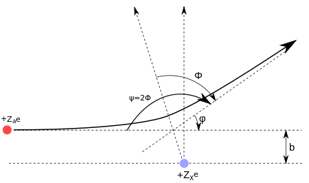 Weźmy pod uwagę rozproszenie jednej cząstki o masie m w polu U(r) nieruchomego centrum sił. Tor cząstki w polu centralnym jest symetryczny względem prostej przechodzącej przez centrum i przez najmniej odległy punkt orbity. W związku z tym obie asymptoty orbity tworzą z tą prostą jednakowe kąty Φ. Kąt φ jest dany całką: