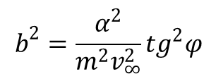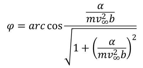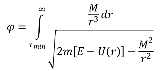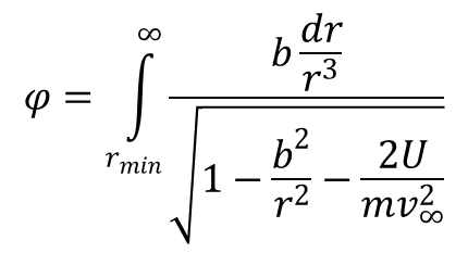 gdzie rmin jest najmniejszą odległością orbity od centrum pola i jednocześnie jest to miejsce zerowe wyrażenia stojącego pod pierwiastkiem. Badając ruch nieskończony wygodniej jest posługiwać się zamiast E i M prędkością cząstki w nieskończoności v∞ i parametrem zderzenia b. Parametr ten jest odległością centrum pola od asymptoty orbity mającej kierunek v∞. Wykorzystując te parametry wyrażenie na kąt φ przyjmuje postać: