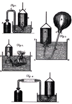 Ilustracja z S. Hales Vegetable Staticks, (1727)Stephen Hales, studiował w Corpus Christi College w Cambridge, był wikariuszem w dzielnicy Londynu Teddington, odmówił kanonii w Windsorze, aby poświęcić się naukowym eksperymentom i obowiązkom parafialnym, zajmując się głównie botaniką. W swoich dwóch książkach: Vegetable Staticks (1727) i Haemastaticks (1733) znalazło się kilka interesujących spostrzeżeń chemicznych. Jego prace chemiczne, prawdopodobnie pod wpływem I. Newtona, mają charakter ilościowy, i stanowią przykład uzyskania mało interesujących wyników uzyskanych przy zaniedbaniu jakościowych właściwości chemicznych badanych substancji, ale, jak wspomniano powyżej jego eksperymenty zainspirowały zarówno J. Blacka, jak i J. Priestleya i innych. S. Hales próbował określić ilość „powietrza”, które można wyizolować z różnych substancji podczas ogrzewania, gromadząc wydzielające się gazy nad wodą. Wśród materiałów jakie badał były węgiel (który dawał „gaz węglowy”), czerwona minia i saletra (tlen), opiłki żelaza i rozcieńczony kwas siarkowy(VI) (wodór) oraz opiłki żelaza i rozcieńczony kwas azotowy(V) (tlenki azotu). Różne gazy były dla Halesa „powietrzem”; ich objętości zostały zmierzone, a następnie gazy były uwalniane ze zbiornika. W niektórych eksperymentach dotyczących oddychania odkrył, że mógłby od dychać pewną stałą objętością powietrza znacznie dłużej, gdyby między wydechem a wdechem, przepuszczać je przez tkaniny zwilżone roztworem potażu, ale nie kontynuował tego eksperymentu „bojąc się że mogę w ten sposób zranić płuca”. Odkrył, że duża ilość powietrza jest pochłaniana podczas spalania fosforu. Doszedł do niejasnego wniosku, że „powietrze obfituje w substancje pochodzenia zwierzęcego, roślinnego i mineralnego”, i że obecność powietrza powoduje fermentację substancji organicznych. Pisze, że rośliny czerpią pewną część pożywienia przez liście z powietrza (co później stwierdził również J. Priestley), i podkreślał, że „stan wolny nie jest zasadniczą cechą właściwości cząstek powietrza; ale, jak widzimy, łatwo ulegają zmianie ze stanu wolnego w związany, dzięki silnemu przyciąganiu cząstek kwasu, siarki i soli fizjologicznej, które występują w powietrzu ”, ale także są w stanie ponownie powrócić do stanu wolnego. Uważał powietrze za żywioł