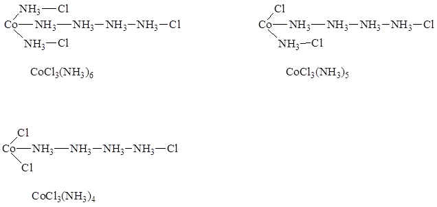 Jak łatwo zauważyć układ łańcuchowy cząsteczek amoniaku przypomina łańcuchy węglowe charakterystyczne dla związków organicznych. Takie podejście wyjaśniało różnice w ilości jonów chlorkowych strącanych jonami srebra z roztworów tych związków.