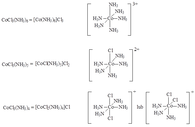 Druga koncepcja budowy tego typu związków pojawiła się w roku 1893 za sprawą Alfreda Wernera. Ten niemiecki chemik oparł swoje rozważania o pomiary konduktometryczne roztworów tych samych związków kobaltu. Na podstawie swoich badań zaproponował teorię wartościowości wyjaśniającą budowę związków koordynacyjnych. Zgodnie z jego koncepcją pierwiastki wykazują dwa rodzaje wartościowości: główną i poboczną dążąc do wysycenia obydwu. Wartościowość poboczna dodatkowo jest skierowana w konkretne miejsca przestrzeni. Zgodnie z jego koncepcją przedstawione powyżej związki można opisać wzorem [Co(NH3)6-nCln]X3-n, gdzie n <0,1,2>, a ich rzeczywista budowa jest następująca: