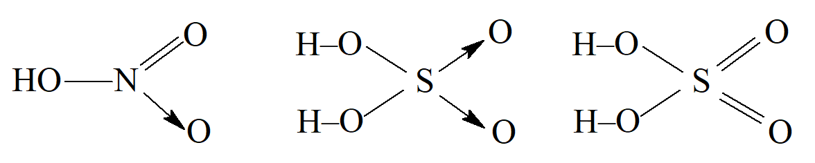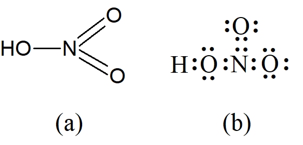 Grupa nitrowa NO2 została pierwotnie określona jako zawierająca pięciowartościowy azot, a kwas azotowy(V) w formie (a). Kwas azotowy(V) można przedstawić jako zawierający czterowartościowy azot (jak w jonie amonowym) poprzez zastąpienie jednego podwójnego wiązania między azotem i tlenem pojedynczym wiązaniem utworzonym przez parę elektronową zlokalizowaną na azocie przenoszoną do atomu tlenu, jak pokazano na (b) [należy pamiętać, że to historia chemii!]: