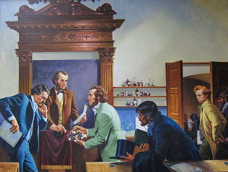 W 1858 r. F. A. Kekulé zasugerował, że atomy węgla benzenu, a zwłaszcza naftalenu, są gęściej ułożone niż w większości związków organicznych („eine dichtere Aneinanderlagerung des Kohlenstoffes”). Wzór benzenu został po raz pierwszy zadowalająco zapisany przez Kekulé w 1865 roku. Podał także wskazówkę dotyczącą budowy tak zwanych „związków aromatycznych”, które zawierają zamknięte pierścienie atomów węgla, w przeciwieństwie do otwartych łańcuchów w tak zwanych „związkach tłuszczowych” lub „alifatycznych”. (Nazwy aromatyczne i alifatyczne pochodzą odpowiednio od Kekulé i Hofmanna). Geneza odkrycia została opisana przez Kekulé: podczas drzemki w swoim gabinecie w Gandawie zobaczył długie łańcuchy atomów węgla, jak węże skręcające się i zwijające, aż jeden „Chwycił własny ogon, a obraz wirował pogardliwie na moich oczach” (August Kekulé, Chemische Berichte, 1890, 23, 1306).