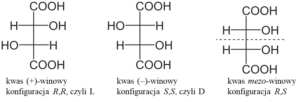 Optycznie aktywne kwasy winowe zawierają dwa asymetryczne atomy węgla, a także możliwy jest trzeci izomer, w którym kompensują się dwa obroty wynikające z dwóch asymetrycznych atomów węgla, a cząsteczka jest nieaktywna jako całość. Ta postać, znana jako kwas mezowinowy, została otrzymana przez Pasteura; różni się od kwasu racemicznego, który jest połączeniem kwasów d– i l–winowego: