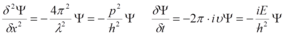Rozważmy cząstkę poruszającą się swobodnie wzdłuż osi x. Ruch falowy tej cząstki można opisać funkcją falową typu: Ψ=Ψ(x,t). Najprostsza fala, to fala harmoniczna o takiej właściwości, że zwiększenie odległości x o λ, czyli długość fali, lub zwiększenie czasu t, o odwrotność częstości powoduje powtarzanie się takich samych właściwości Ψ. W tym przypadku funkcja Ψ zależy od x za pośrednictwem czynnika exp(±2πi kx), gdzie k oznacza liczbę falową czyli odwrotność długości fali k=1/λ. Zależność od czasu wyraża podobny czynnik równy exp(±2πivt), gdzie v jest częstością drgań. Ponieważ wyrażenie exp (i ω)=cosω + isinω, to obydwa człony wykładnicze są kombinacjami wyrazów sinusoidalnego i kosinusoidalnego. W ogólnym przypadku należy brać pod uwagę kombinacje wszystkich czterech możliwych iloczynów branych ze stałymi współczynnikami. Zwiększenie x o λ powoduje zwiększenie wykładnika o +2πi, czyli pomnożenie Ψ przez exp(±2πi ), czyli przez wartość 1. Równania jakie spełniają te wszystkie kombinacje możliwych iloczynów można wyznaczyć rozwiązując równania różniczkowe drugiego rzędu względem położenia x i czasu t: