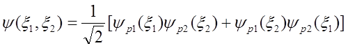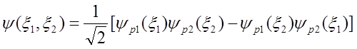 W przypadku fermionów funkcja falowa jest antysymetryczną kombinacją iloczynów, a tym samym dla układu złożonego z dwóch cząstek mamy: