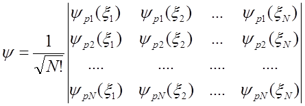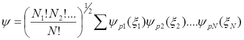 gdzie sumowanie odbywa się po wszystkich permutacjach wskaźników p1, p2, ..., pN, a liczba N wskazuje ile tych wskaźników ma jednakowe wartości. Przy całkowaniu kwadratu |ψ|2 po dζ1, dζ2, ..., dζN znikają wszystkie człony z wyjątkiem kwadratów modułów każdego z członów sumy, czyli całkowita liczba członów w sumie jest równa: N!/N1!N2!.... , z tego wynika współczynnik unormowania w powyższym wzorze.