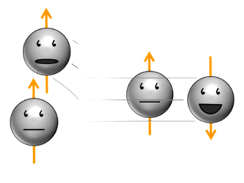 Teraz rozpatrzmy układ złożony z dwóch cząstek o spinie połówkowym. Teraz funkcja falowa układu jest iloczynem dwóch funkcji zależnych od spinu i współrzędnych i powinna być antysymetryczna względem przestawienia cząstek. Zatem, jeżeli orbitalna funkcja falowa jest symetryczna, to funkcja spinowa powinna być antysymetryczna i na odwrót. W ten sposób poziomy energetyczne, którym odpowiadają symetryczne rozwiązania φ(r1, r2) równania Schrödingera mogą występować w rzeczywistości tylko wtedy gdy całkowity spin układu jest równy zero, czyli wtedy gdy spiny obu elektronów są antyrównoległe. Wartości energii należące do stanów opisywanych antysymetrycznymi funkcjami falowymi odpowiadają układowi o całkowitym spinie równym jedności, to znaczy sytuacji, gdy spiny obydwu cząstek są równoległe, W związku z tym możliwe wartości energii układu zależą od całkowitego spinu. W tym sensie można mówić o specyficznym oddziaływaniu cząstek. Oddziaływanie tego typu nosi nazwę oddziaływania wymiennego