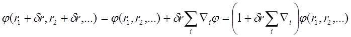 Weźmy pod uwagę zamknięty układ cząstek, na który nie działa pole zewnętrzne. W takim przypadku wszystkie położenia układu w przestrzeni są równoważne a tym samym hamiltonian układu nie zmienia się przy równoległym przesunięciu układu na dowolną odległość. Zażądajmy aby ten warunek był spełniony przy dla nieskończenie małego przesunięcia przez co będzie on spełniony dla każdego skończonego przesunięcia układu. Przesunięcie nieskończenie małe powoduje, że promienie wodzące ri wszystkich cząsteczek uzyskują jednakowe przyrosty δr. Przy takim przesunięciu funkcja współrzędnych cząstek φ(r1, r2, ....) przechodzi w funkcję: