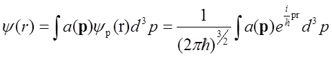 gdzie u(r) oznacza funkcję różniącą się od zera jedynie w obszarze Δx, Δy i Δz. Rozwijając te funkcję w szereg Fouriera otrzymujemy współczynniki rozwinięcia a(p) są całkami z funkcji postaci u(r)ei(p0–p)/ħ. Aby taka całka różniła się od zera okresy oscylacyjne ei(p0–p)/ħ muszą być nie mniejsze niż rozmiary obszaru Δx, Δy, Δz. Z tego wynika, że a(p) będzie różnić się od zera dla takich wartości p, dla których (p0x–p)/ħΔx ≤ 1, ... .Ponieważ |a(p)|2określa prawdopodobieństwo wartości pędu, to przedziały wartości px, py i pz w których a(p) nie znika są przedziałami wartości, w których zawarte są składowe pędu cząstki w rozpatrywanym stanie. Z tego wynikają relacje nieoznaczoności sformułowane przez Heisenberga w postaci: