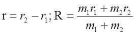 r – oznacza wektor wzajemnej odległości pomiędzy cząstkami, a R promień wodzący środka masy cząstek. Teraz hamiltonian układu ma postać: