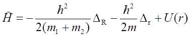 gdzie ΔR i Δr są operatorami Laplace’a odpowiednio względem wektorów R i r, m1+ m2 całkowitą masą układu, a m=m1m2/(m1+ m2) jest zredukowaną masa układu. Ponieważ hamiltonian rozpadł się na sumę dwóch niezależnych części to można szukać rozwiązania φ(r1,r2) w postaci iloczynu φ(R)φ(r), gdzie φ(R) opisuje ruch środka masy, φ(r) względny ruch cząstki jako ruch cząstki o masie m w polu centralnym U (r).