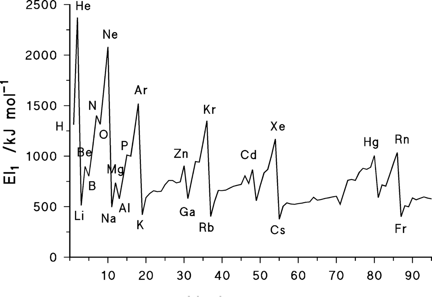 Wyjaśnienie natury odkrytej przez D. Mendelejewa okresowej zmienności właściwości pierwiastków ułożonych w kolejności wzrastającej liczby atomowej wymaga rozważenia osobliwości zapełniania powłok elektronowych atomów. Kolejność zapełniania powłok atomowych odkrył w 1922 roku Niels Bohr. Przechodząc od jednego atomu do następnego zwiększa się o jednostkę ładunek i w powłoce pojawia się kolejny elektron. Przy takim podejściu można by oczekiwać, że energia wiązania każdego z następnych dołączanych elektronów rośnie monotonicznie ze wzrostem liczby atomowej. Jednak w rzeczywistości tak nie jest. W atomie wodoru istnieje jeden elektron w stanie 1s. W atomie helu, następnego pierwiastka, pojawia się następny elektron w stanie 1s, przy czym energia wiązania każdego z elektronów w atomie helu jest znacznie większa niż w atomie wodoru. Wynika to z różnicy pól, w jakich znajdują się elektrony w obydwu atomach. Pola te w dużych odległościach są takie same, ale w pobliżu ładunku +2 w atomie helu pole jest silniejsze niż pole jądra w atomie wodoru o ładunku Z = 1. W atomie kolejnego pierwiastka, litu (Z = 3) trzeci elektron trafia do stanu 2s, gdyż zgodnie z zakazem Pauliego poziom 1s jest już obsadzony maksymalnie. Przy danym Z poziom 2s leży wyżej niż 1s. Natomiast w miarę zwiększania się ładunku jądra poziomy te obniżają się na skali energii, ale przy przejściu pomiędzy Z = 1 do Z = 2 pierwszy efekt znacznie przewyższa drugi i dlatego energia wiązania trzeciego elektronu w atomie litu jest znacznie mniejsza od energii wiązania elektronów w atomie helu. W atomach od berylu (Z = 4) do neonu (Z =10) kolejno przybywa jeszcze jeden elektron w stanie 2s i kolejne elektrony w stanie 2p. Energia wiązania tych elektronów wzrasta na skutek zwiększania się ładunku jądra. Kolejny elektron w atomie sodu trafia na poziom 3s, a efekt przejścia do wyższej powłoki przewyższa efekt zwiększania ładunku jądra. Tym samym energia wiązania wyraźnie maleje. Taki obraz zapełniania powłok elektronowych jest charakterystyczny dla całego układu okresowego pierwiastków. W związku z tym w kolejnych pierwiastkach w okresach w miarę zapełniania elektronami energia ich wiązania wzrasta i wyraźnie zmniejsza się przy przechodzeniu do następnego okresu. Zmiany te obrazują potencjały jonizacyjne pierwiastków odpowiadające energii wiązania elektronów w atomach.