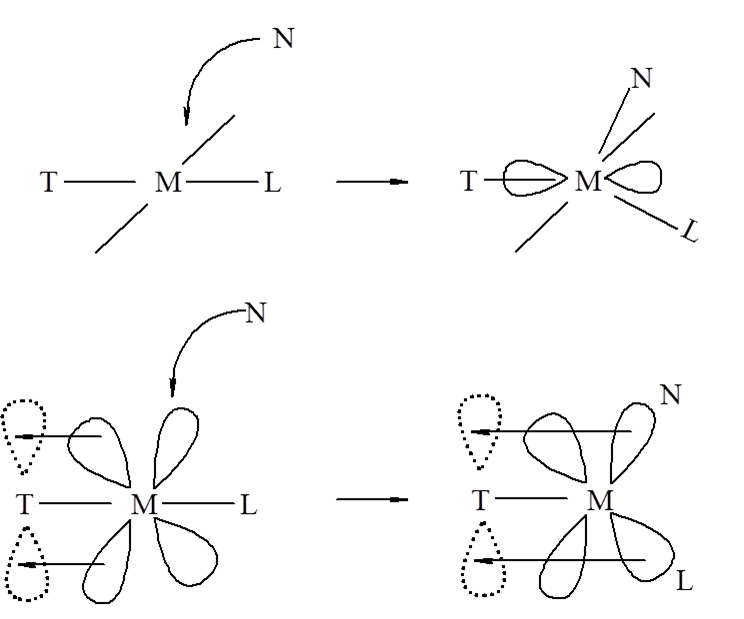 W przypadku ligandów będących silnymi akceptorami π, jak cząsteczka CO, ligand T przyjmuje ładunek z obsadzonego orbitalu d metalu, który w przeciwnym razie mógłby odpychać ligand L i nukleofilowy układ podstawiający w pięciokoordynacyjnym związku przejściowym. Akceptacja ładunku prze ligand w pozycji trans stabilizuje związek przejściowy i ułatwia przebieg reakcji. Obydwa mechanizmy można przedstawić schematycznie w sposób następujący: