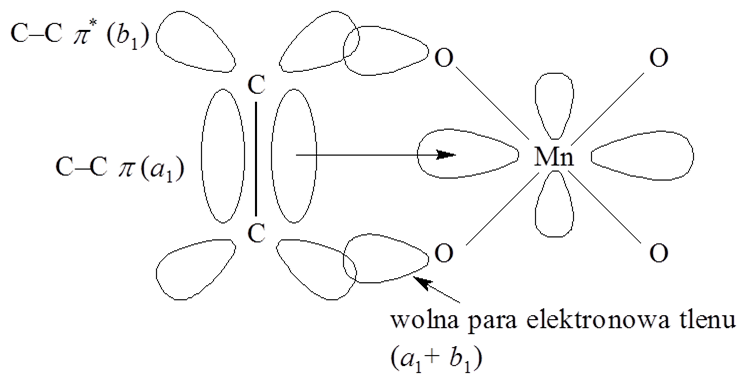Wolne pary elektronowe dwóch atomów tlenu przekształcają się jak a1 + b1, a orbital b1 może się nakładać z antywiążącym orbitalem π* wiązania C–C. Takie oddziaływanie powoduje osłabienie wiązania π C–C, które dodatkowo zostaje osłabione w wyniku przeniesienia elektronu z orbitalu π alkenu na orbital dz2 manganu w wyniku czego mangan redukuj się do Mn(V) i następuje zerwanie wiązania podwójnego w aleknie i utworzenie dwóch wiązań C–O. W przypadku cyklicznych alkenów może zajść hydroliza prowadząca do alkoholu dihydroksylowego.