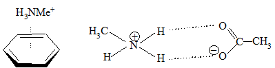 Biorąc pod uwagę, że wartość entalpii oddziaływania jonu potasowego z wodą wynosi –17,9 kcal/mol można zauważyć, że jon ten silniej oddziałuje z pierścieniem benzenowym. Jednak efekt solwatacyjny wody jest na tyle duży, że porównywanie tylko wartości entalpii może być mylące. Chociaż w polarnych rozpuszczalnikach oddziaływania π–kation są na tyle silne, że mogą konkurować z wiązaniami wodorowymi. Przyjrzyjmy się obliczonym wartością entalpii oddziaływania czwartorzędowej soli metyloamoniowej z benzenem oraz wiązania w octanie N–metyloaminy w układach różniących się stałą dielektryczną, czyli układom: