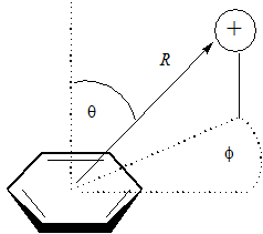 gdzie R oznacza odległość pomiędzy środkiem pierścienia a kationem; θ jest wartością kąta 90°–wartość odchylenia od płaszczyzny pierścienia, a Φ oznacza kąt rotacyjny w płaszczyźnie. W tabeli poniższej przedstawiono wybrane wartości tych wielkości i jak widać dla pewnych wartości zebranych w drugim wierszu tabeli oddziaływanie kation–π jest silne.