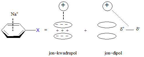 Obecność podstawników w pierścieniu aromatycznym powoduje pojawienie się czynnika odpowiedzialnego za oddziaływanie jon–dipol w całkowitej energii układu kation–π. Takie podejście nie wymaga pojawienia się znacznej polaryzacji w układzie kation–π, chociaż ma ona miejsce w przypadkach podstawników czy kationów o znacznej elektroujemności. Destabilizujące układ aromatyczny silnie akceptorowe podstawniki powodują zmniejszenie siły oddziaływania kationów z układem aromatycznym co daje widać porównując wartości energii oddziaływania kationu sodowego z pochodnymi benzenu: