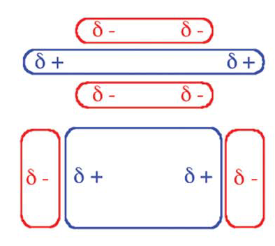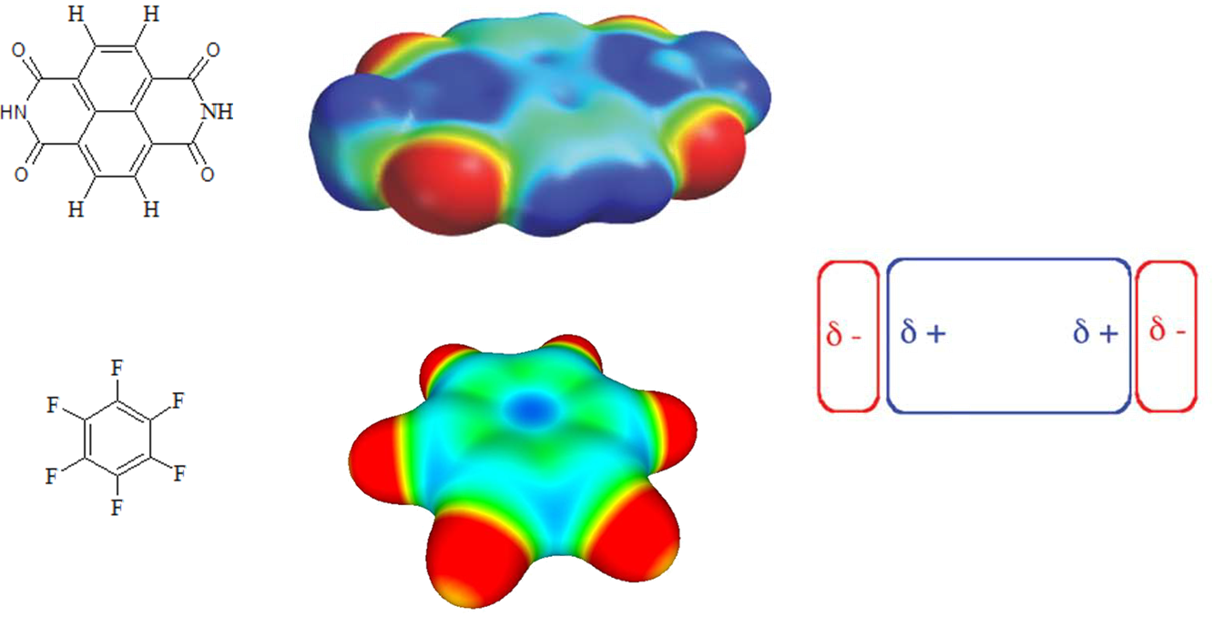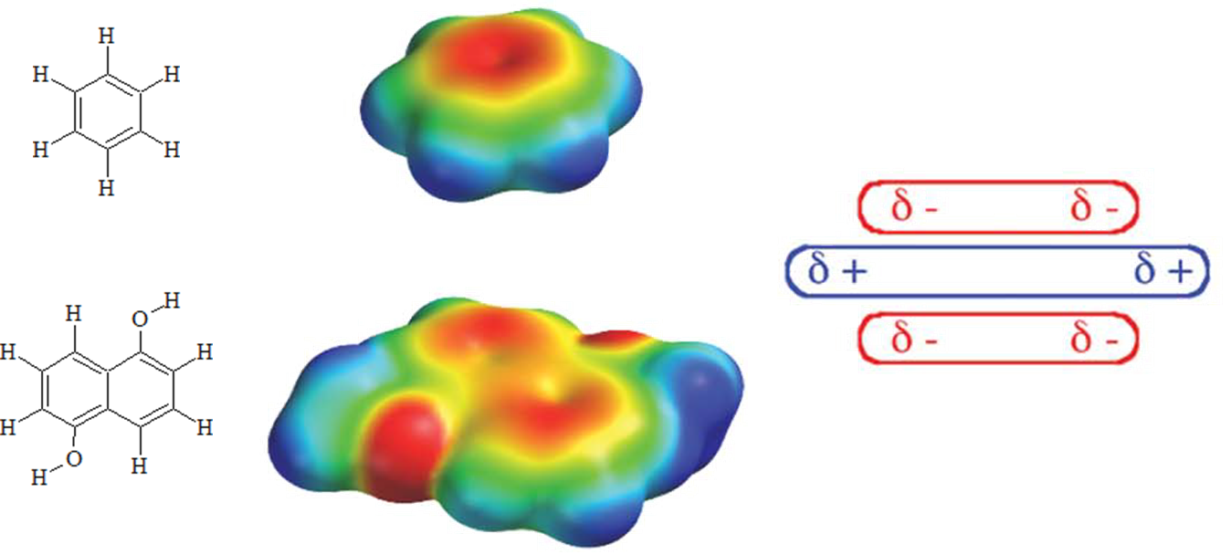 Jak łatwo zauważyć silnie destabilizujące układ aromatyczny podstawniki powodują zmianę rozkładu ładunku na cząsteczce związku, co ma wpływ na układ (geometrię) oddziaływujących cząsteczek. Weźmy pod uwagę dwie cząsteczki benzenu lub 1,5-dihydroksynaftalenu, w przypadku których mamy duży ładunek cząstkowy zlokalizowany nad i pod płaszczyzną pierścienia.